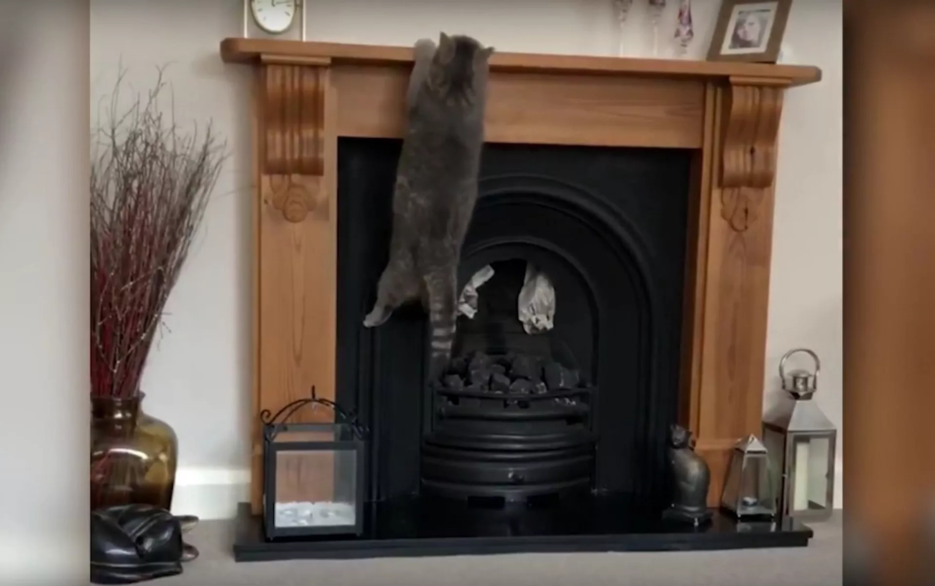 Storas katinas nesugebėjo užšokti ant židinio lentynos ir pakibo. YouTube "Daily Mail" kanale paviešintas juokingas vaizdo įrašas.
