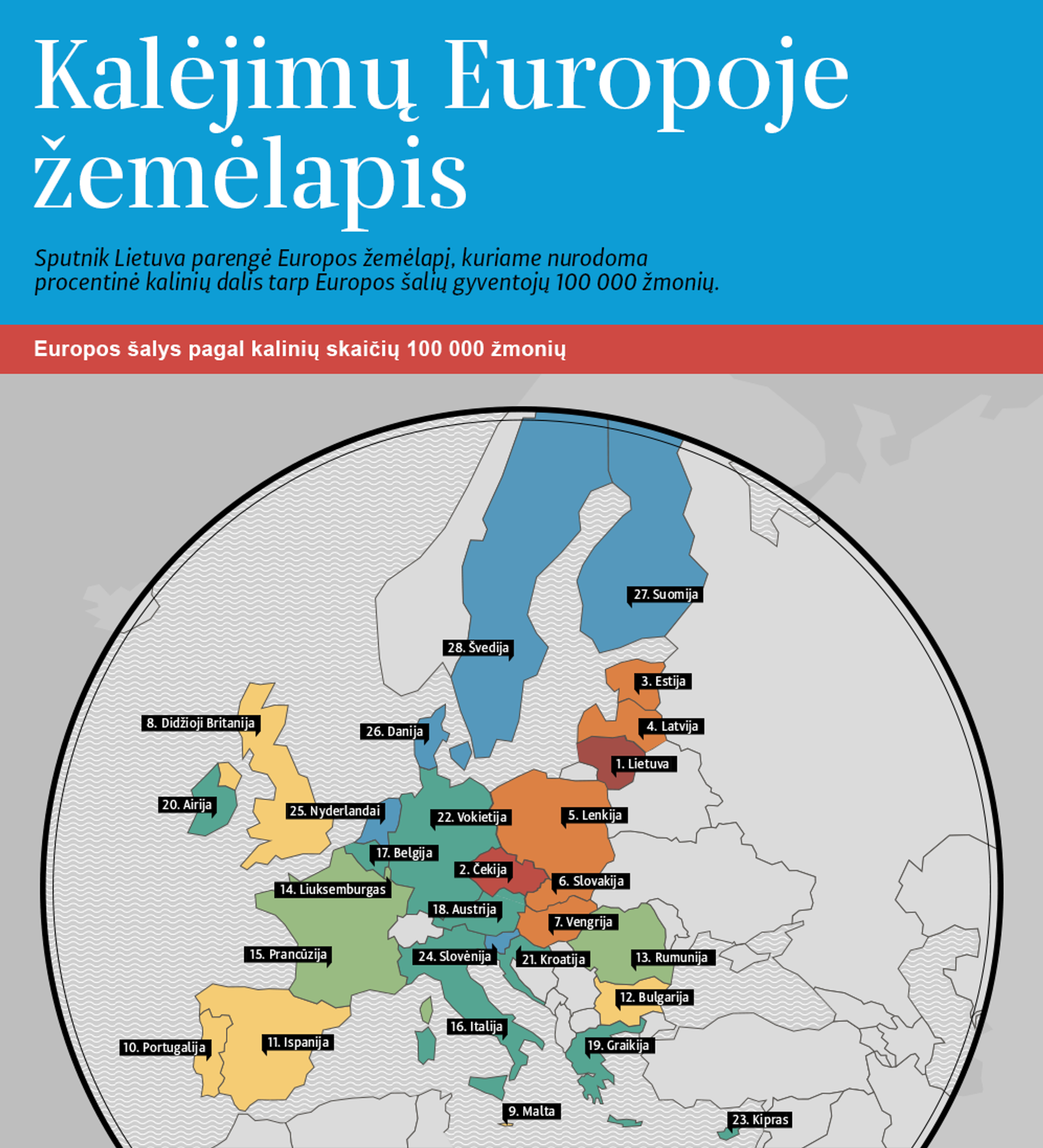 "Sputnik Lietuva" parengė Europos žemėlapį, kuriame nurodoma procentinė kalinių dalis tarp Europos šalių gyventojų 100 000 žmonių.