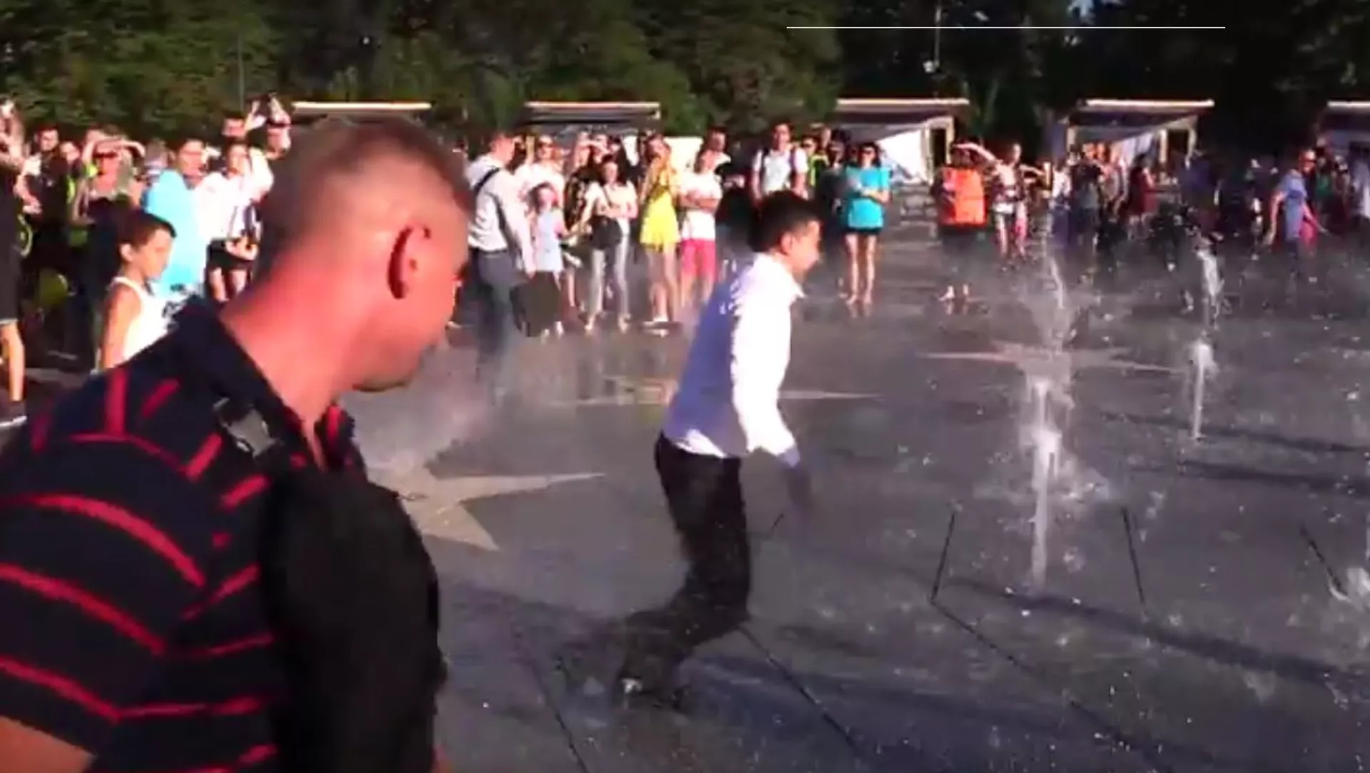 Vaizdo įraše užfiksuota, kaip Ukrainos lyderis išbėga iš žmonių minios fontano link. Kartu su Zelenskiu per vandens sroves perbėgo jo sargybiniai bei kai kurie gyventojai.