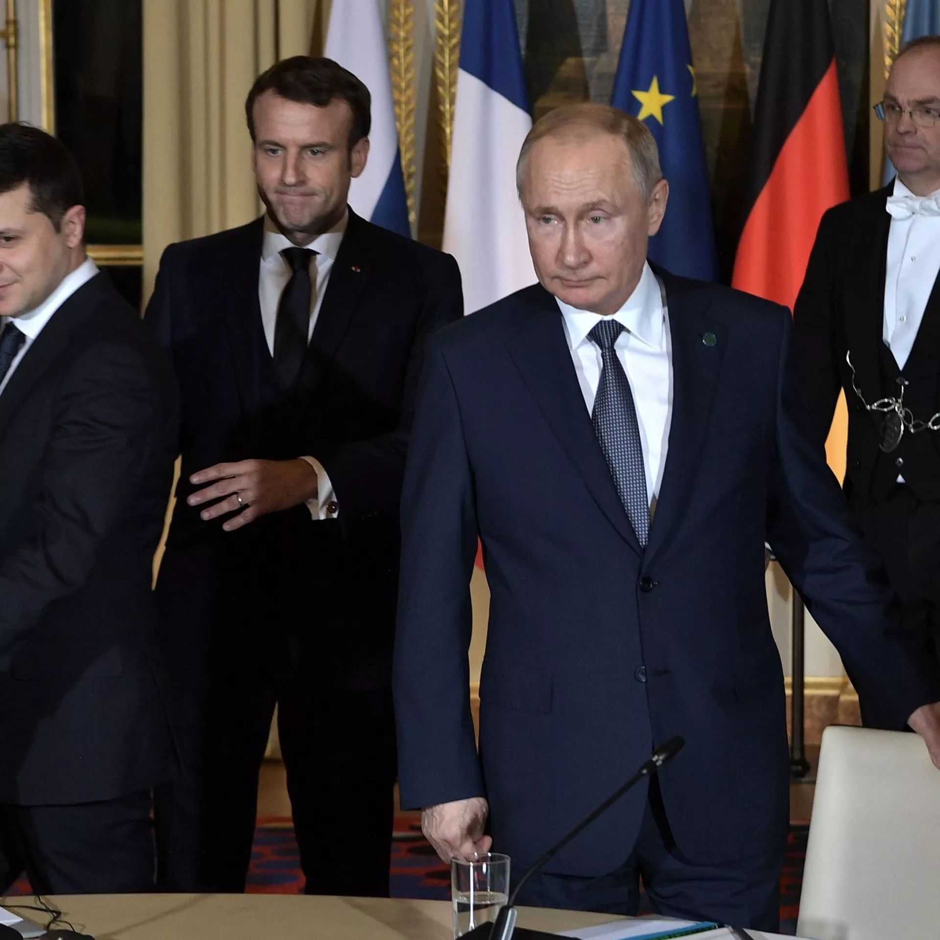 Jis taip pat priminė, kad Putinas ir Zelenskis kalbėjosi akis į akį 10-15 minučių, nes netrukus juos pertraukė Prancūzijos prezidentas Emanuelis Makronas. Jis primygtinai reikalavo tęsti darbą "Normandijos formatu".