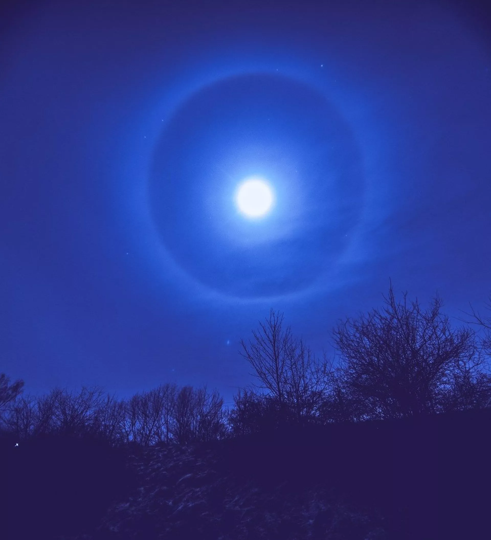 "Kas vakar vakare ilgiau nenuėjo miegoti ir dar pasižiūrėjo pro langą galėjo atsidurti tinkamoje vietoje ir tinkamu laiku. Nuotraukoje matote gana retą halo formą, kai aplink mėnulį susiformavęs ne 1, bet 2 žiedai. <…> Jis susiformuoja kai šviesa sklinda per piramidės formos ledo kristalus. Šis reiškinys tikrai nėra dažnas, tačiau kaip matote Lietuvoje visko galime sulaukti", — teigiama pranešime.