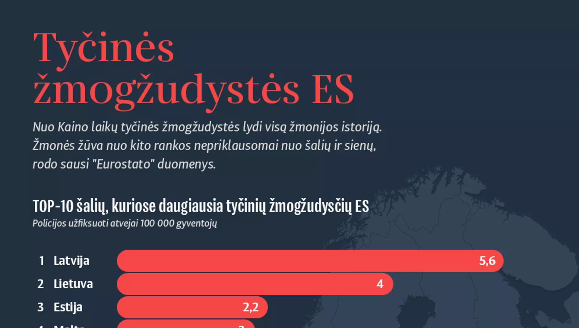 Daugiausia ES tyčia nužudoma žmonių Latvijoje: 2017 metais ten buvo užregistruoti 5,6 atvejai šimtui tūkstančių gyventojų.