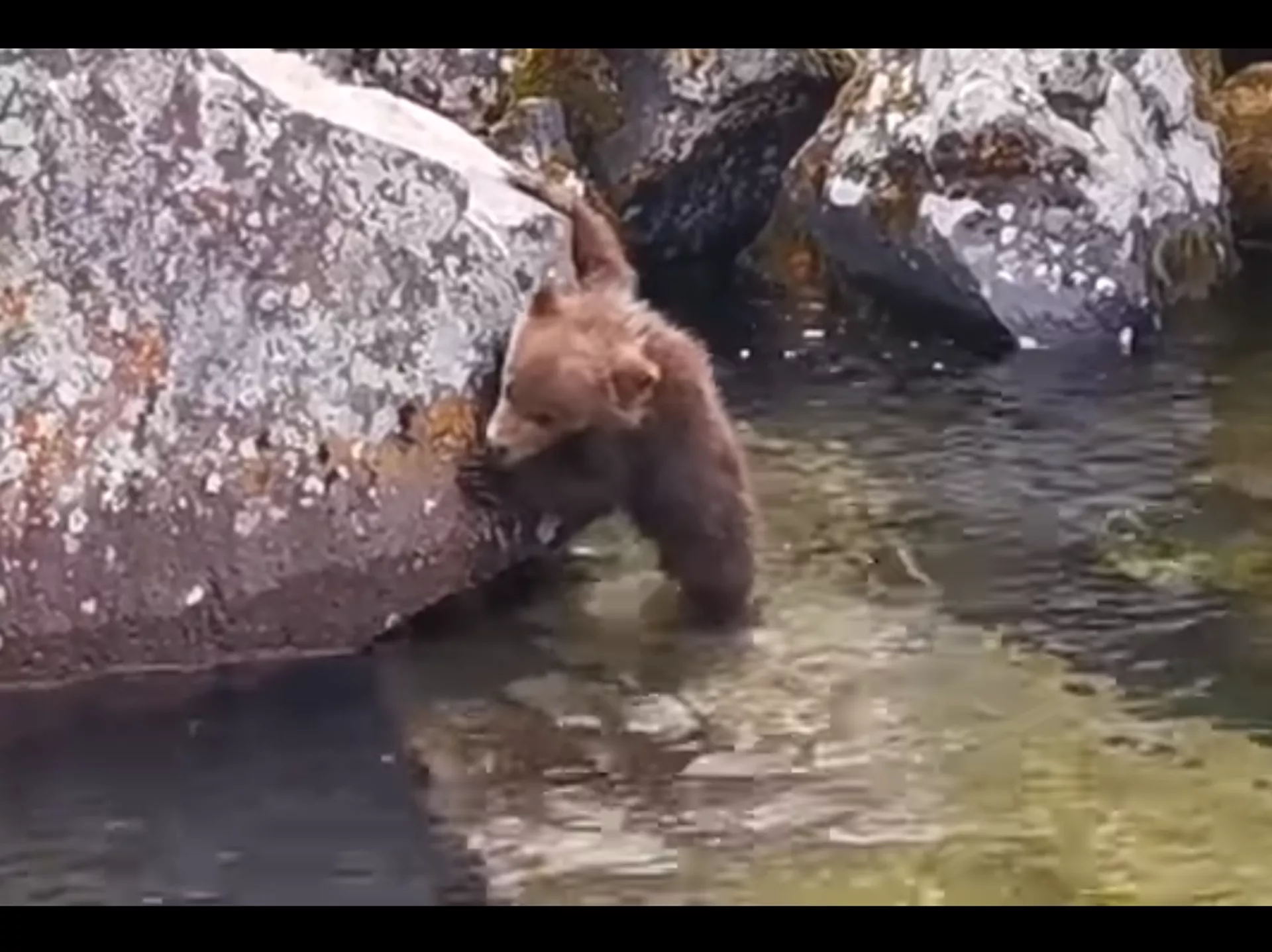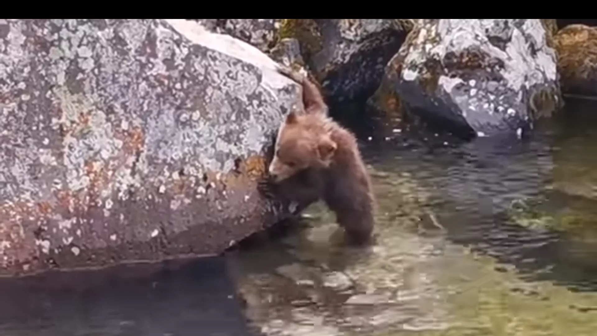 "Pametęs motiną, meškiukas skuba jos ieškoti. Vargais negalais jam pavyksta įlipti į vandenį. Jaunikliai meškiukai moka plaukti, tačiau jie tai daro labai nenoriai", — teigė vaizdo įrašo autorė, Kronocko rezervato valstybinė inspektorė Liana Varavskaja.