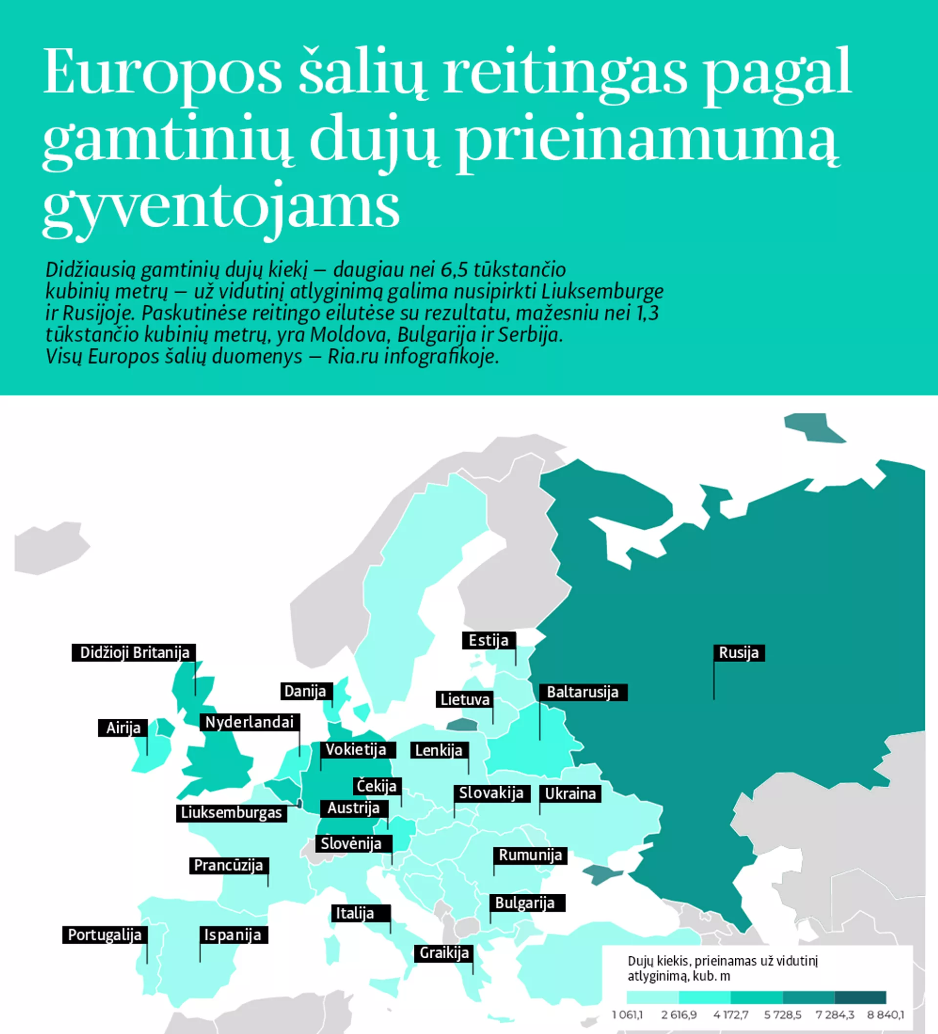 Didžiausią gamtinių dujų kiekį — daugiau nei 6,5 tūkstančio kubinių metrų — už vidutinį atlyginimą galima nusipirkti Liuksemburge ir Rusijoje. Paskutinėse reitingo eilutėse su rezultatu, mažesniu nei 1,3 tūkstančio kubinių metrų, yra Moldova, Bulgarija ir Serbija.