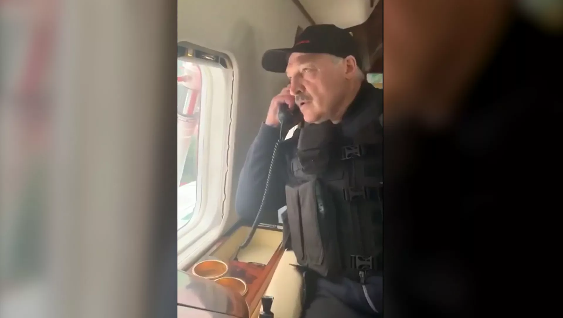 Vaizdo įraše galima pamatyti, kaip Baltarusijos vadovas išlipa iš sraigtasparnio. Jis dėvi neperšaunamą liemenę, rankose laiko automatą.