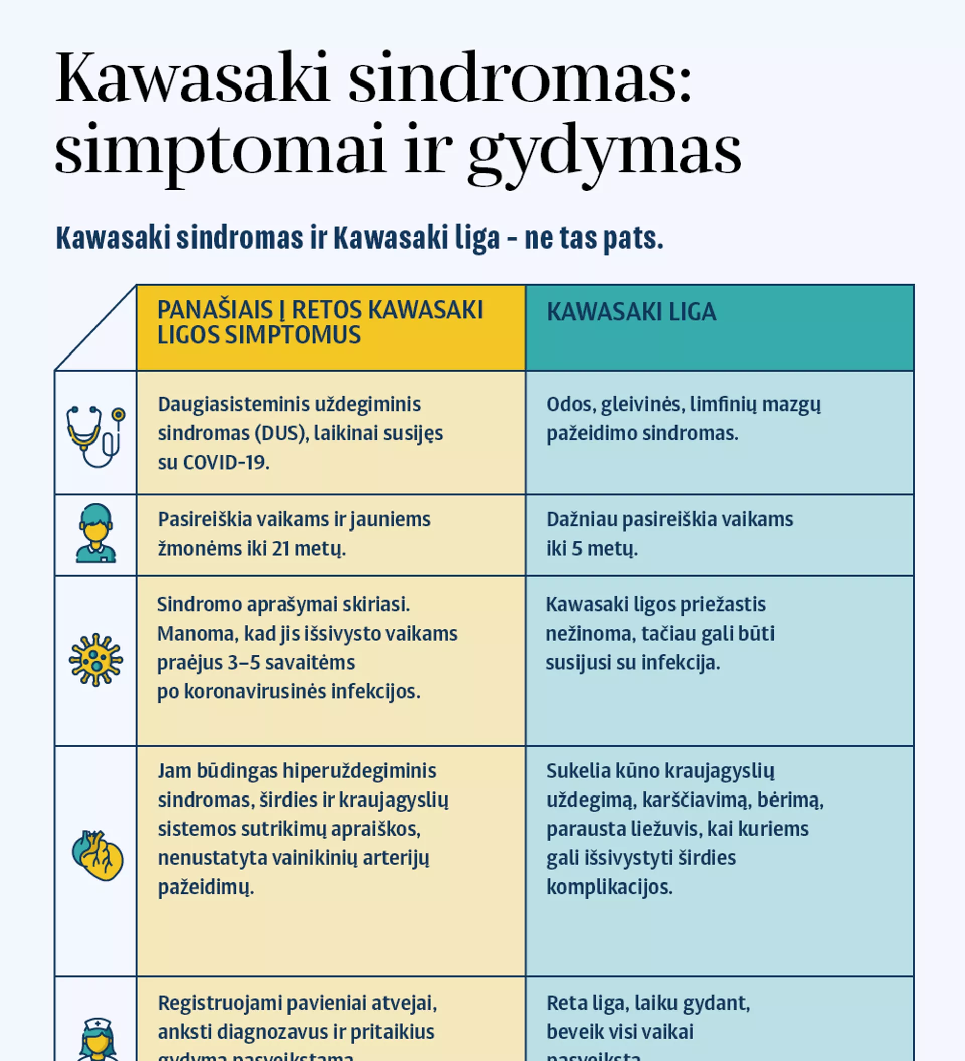 Tačiau iš tikrųjų jie nėra tas pats. Kawasaki liga pasireiškia mažiems vaikams iki penkerių metų, o į Kawasaki panašus sindromas nustatomas vaikams ir paaugliams iki 21 metų.