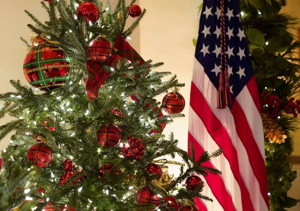 Oficiali eglė Mėlynojoje salėje buvo papuošta žaislais, kuriuose pavaizduoti vaikų piešiniai, jaunieji amerikiečiai nutapė tai, kas, jų nuomone, gražina jų šalį.