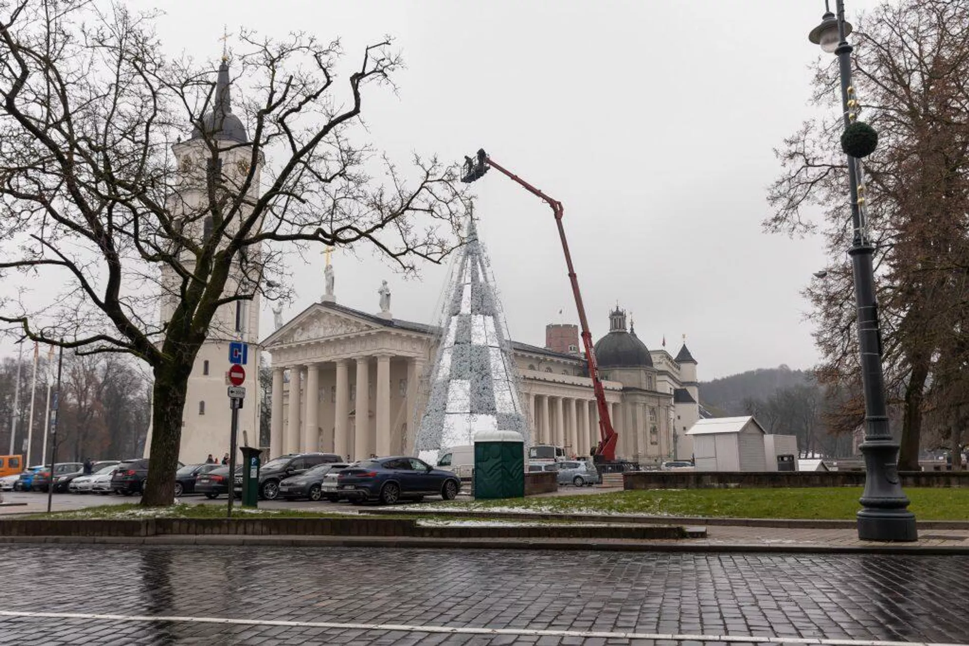 Nors visą Kalėdų eglės Katedros aikštėje grožį bus galima išvysti tik šeštadienio vakarą, dar tebepuošiant ją matyti, kad 2021 metų Vilniaus eglė bus tikros baltos žiemos ir šviesių spindinčių Kalėdų simbolis.