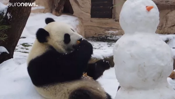 Suvalgė nosį ir nusuko galvą: panda Dindin pirmą kartą sutiko sniego senį — video